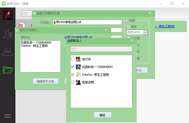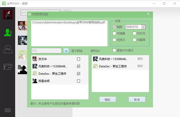 點(diǎn)擊“是”,會(huì)彈出權(quán)限管理界面,可以控制文檔的有效時(shí)間、編輯、打印、拷貝、截屏權(quán)限