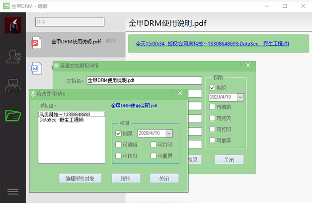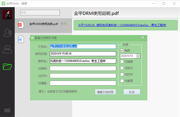 點(diǎn)擊記錄,可以隨時(shí)根據(jù)工作需要修改被授權(quán)人文檔使用權(quán)限,如增加使用時(shí)間或編輯權(quán)限等